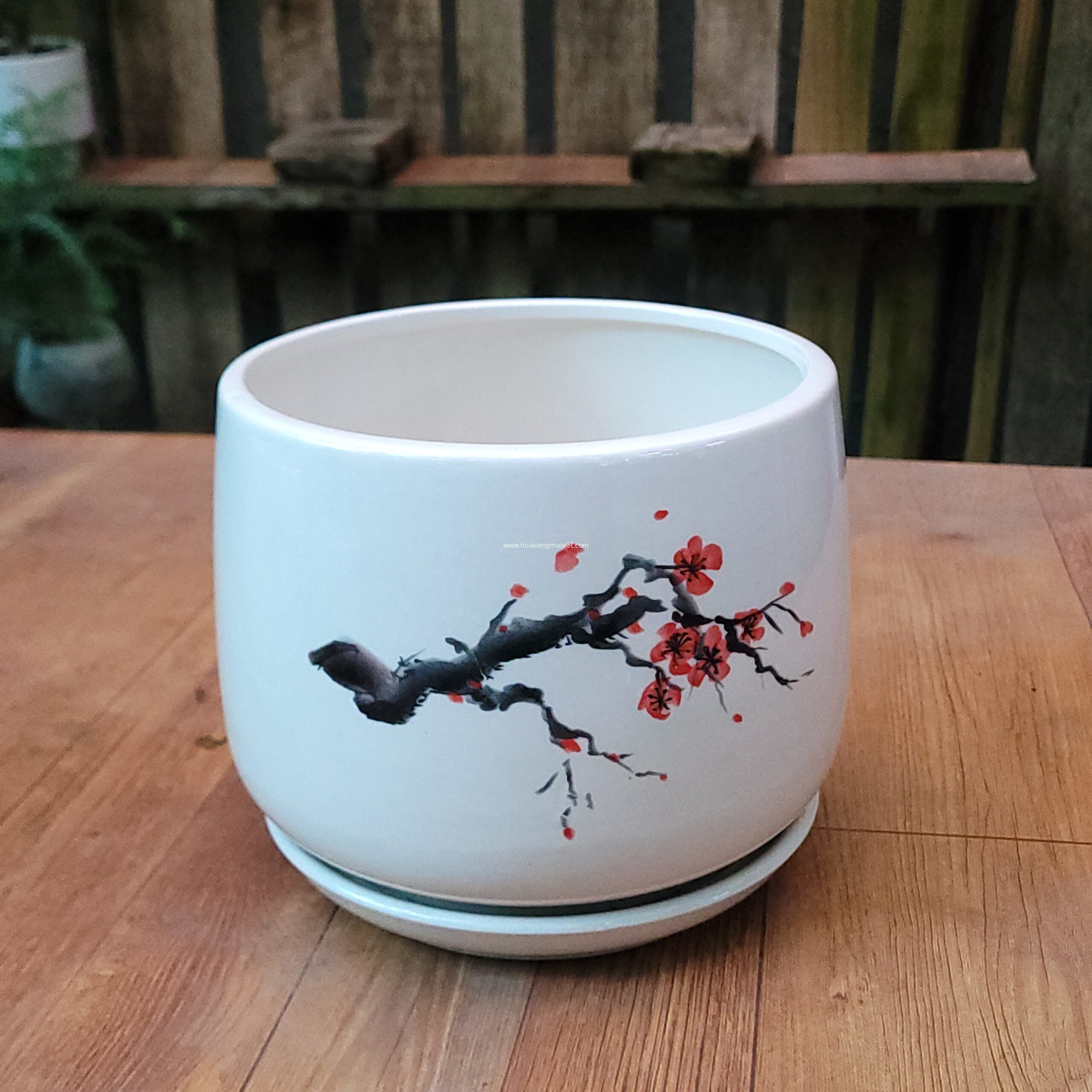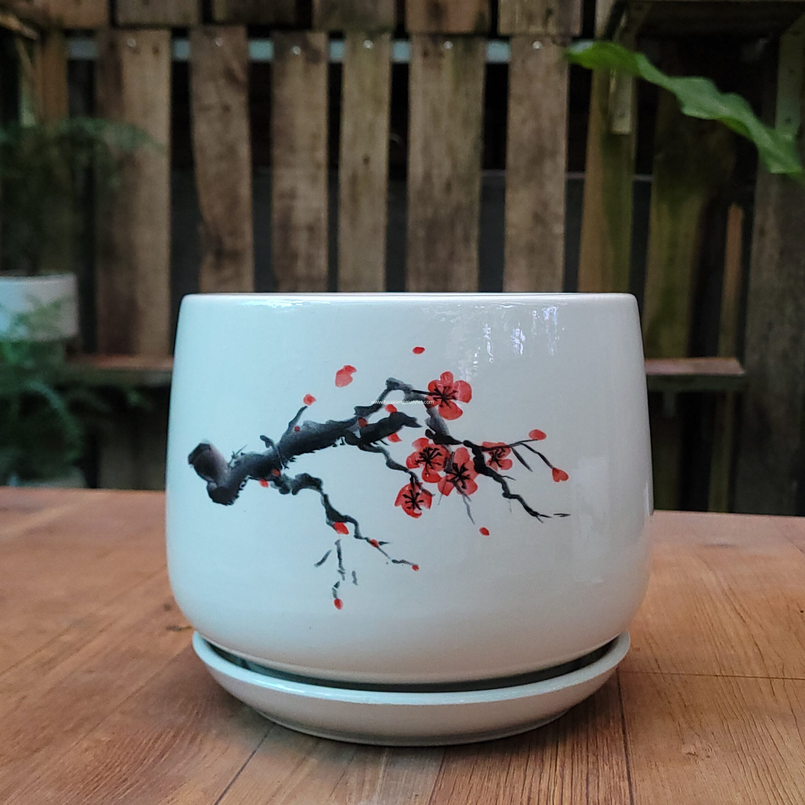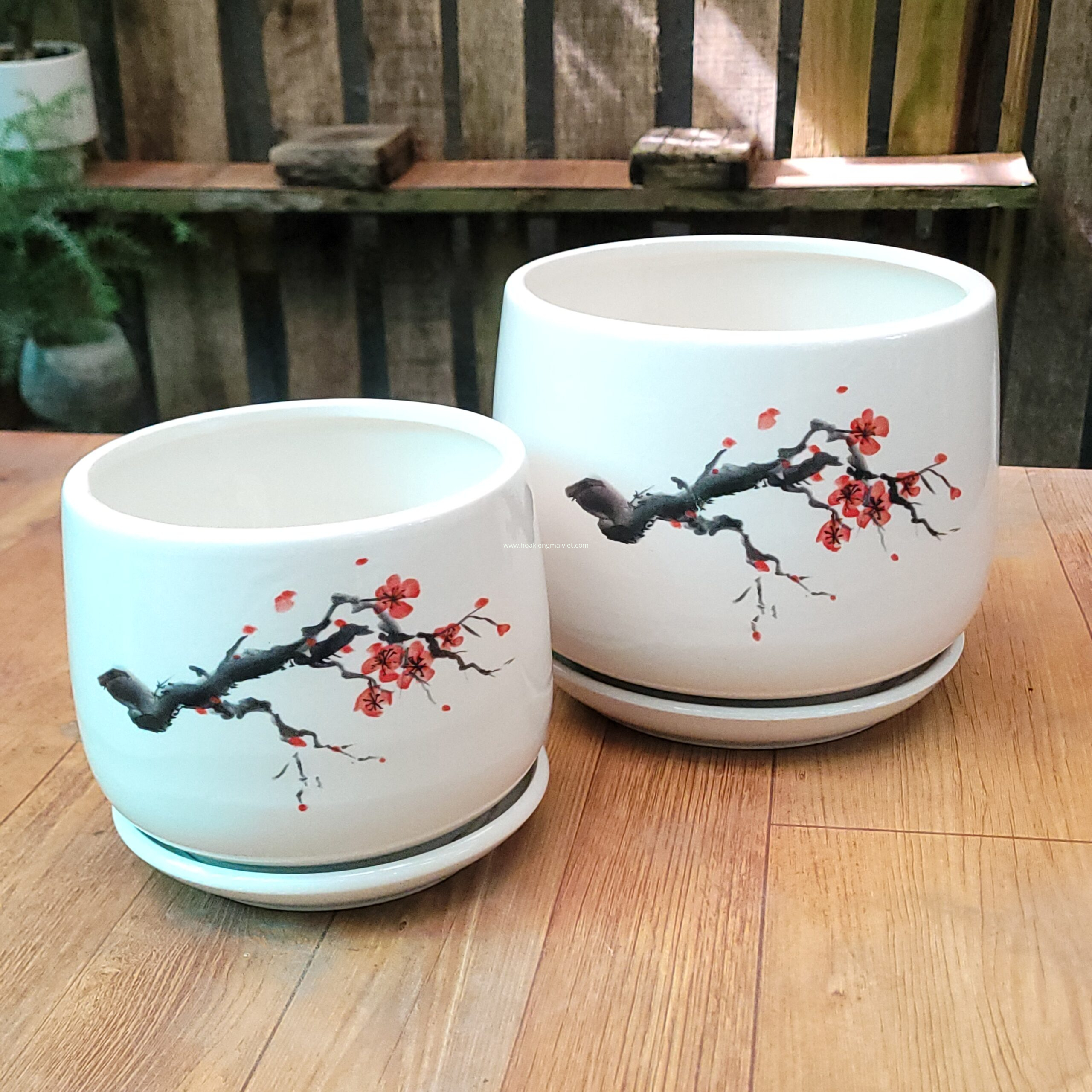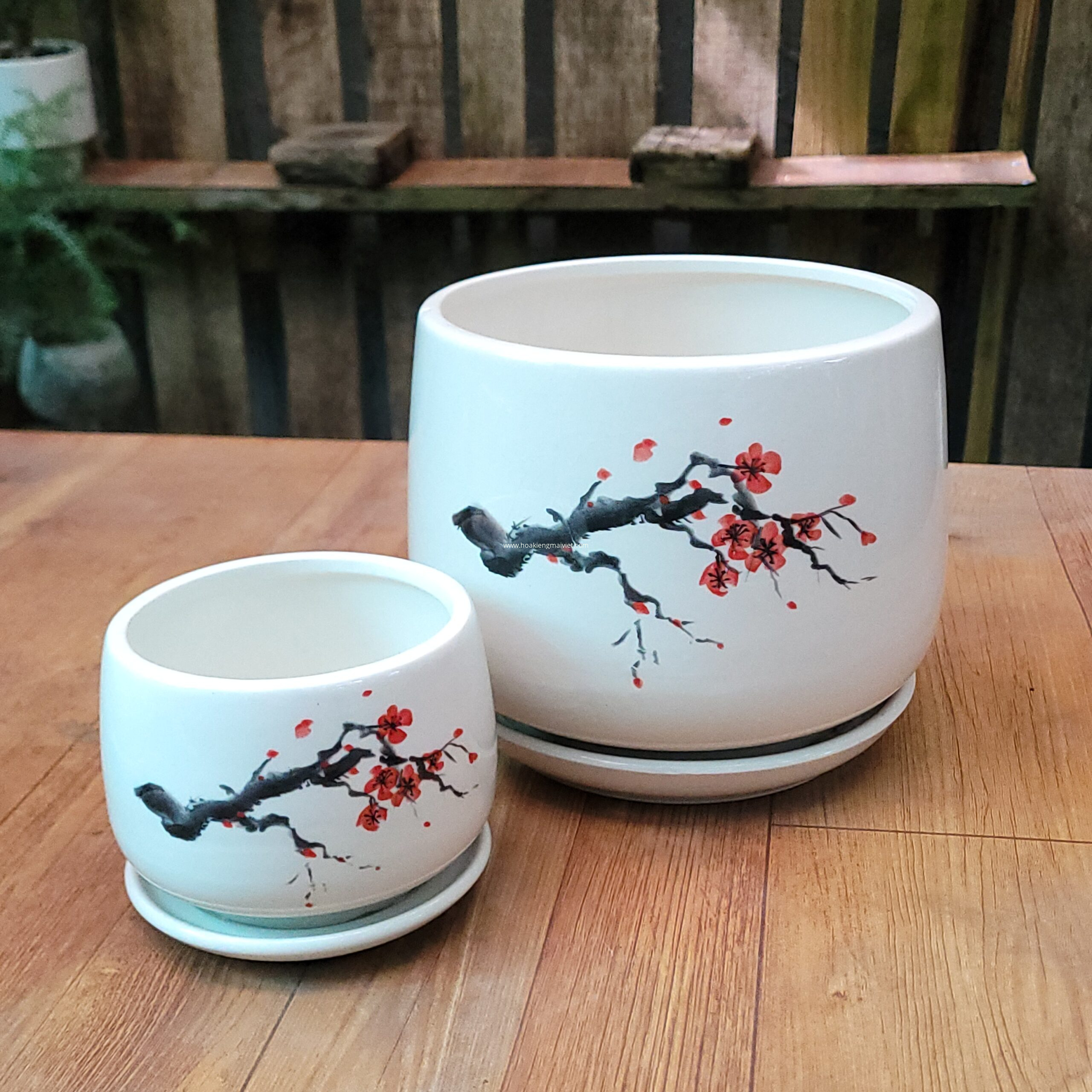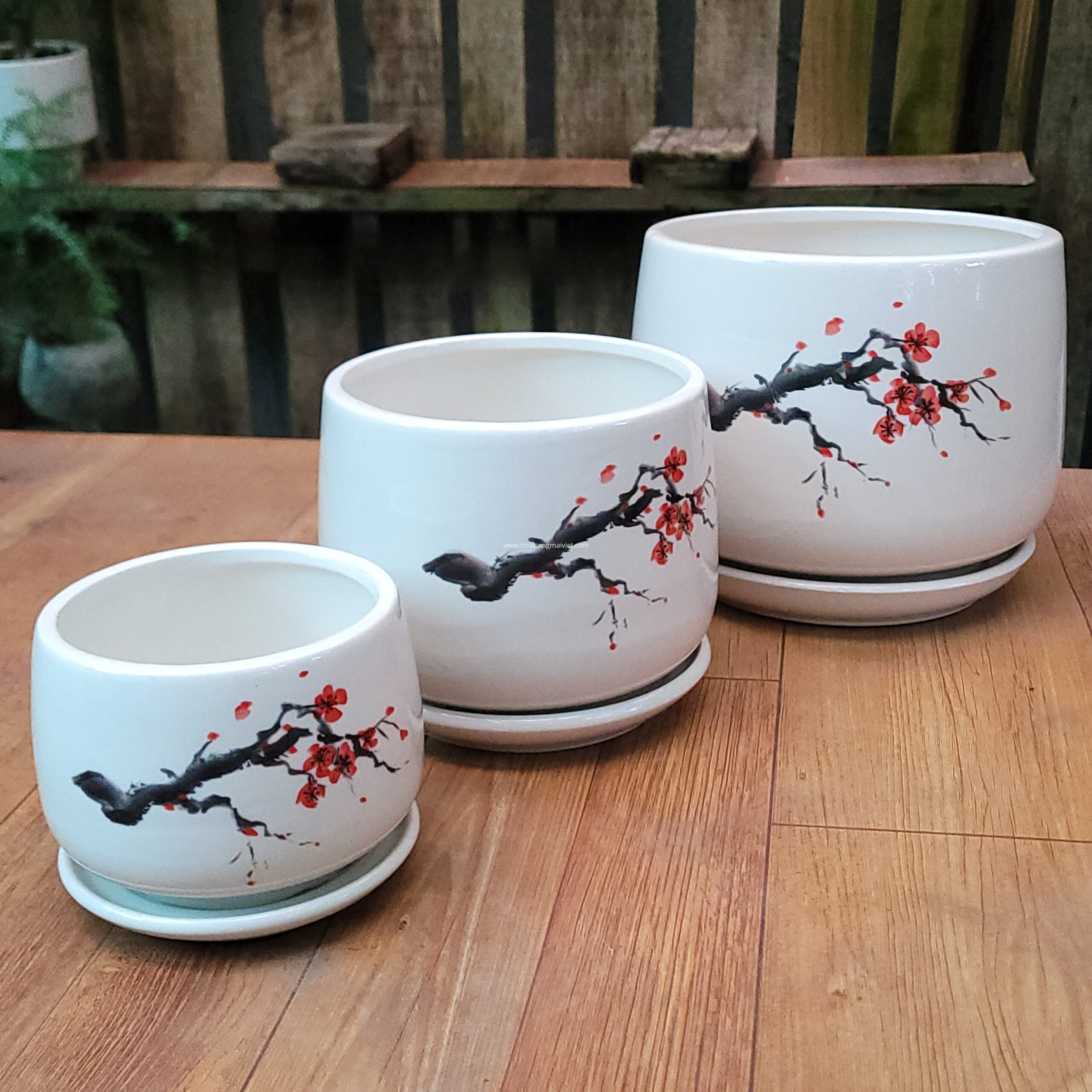 🌸 Bộ 3 Chậu Men Sứ Để Bàn MV01 với họa tiết Hoa Đào là sản phẩm trang trí cao cấp, mang đậm nét thanh lịch và tinh tế của nghệ thuật gốm sứ. Chậu được chế tác từ sứ trắng phủ men bóng, tạo độ sáng mịn và bền đẹp theo thời gian. Điểm nhấn nổi bật là họa tiết hoa đào đỏ tươi được vẽ tay tỉ mỉ, tượng trưng cho sự may mắn, khởi đầu mới và vẻ đẹp thuần khiết. Thiết kế nhỏ gọn, phù hợp đặt trên bàn làm việc, bàn học, kệ sách hoặc quầy lễ tân, giúp không gian thêm phần sinh động và gần gũi thiên nhiên.