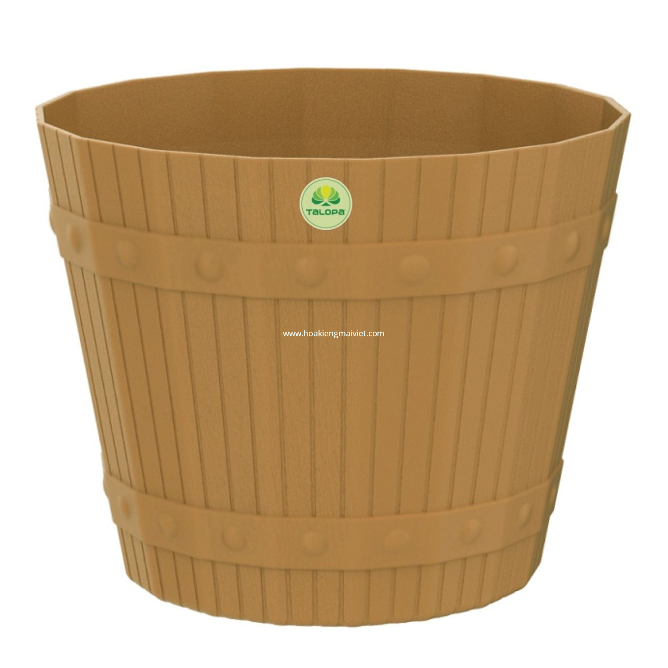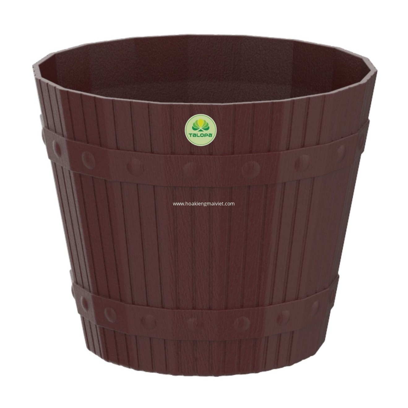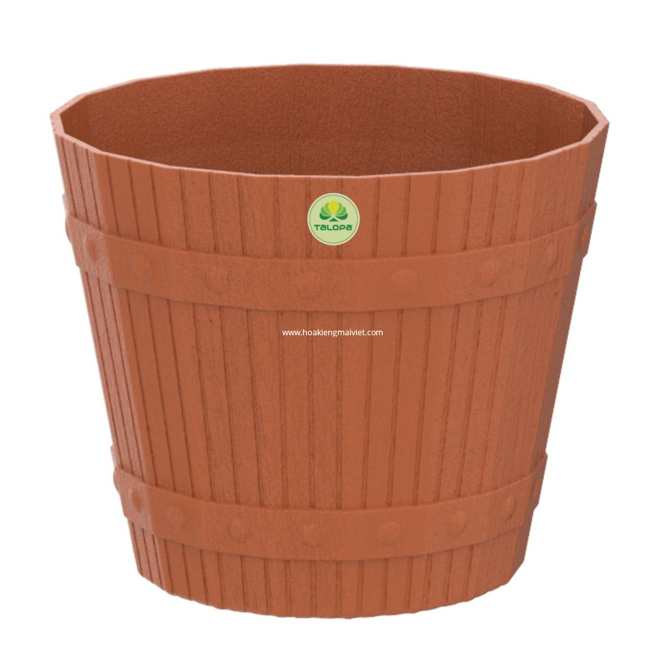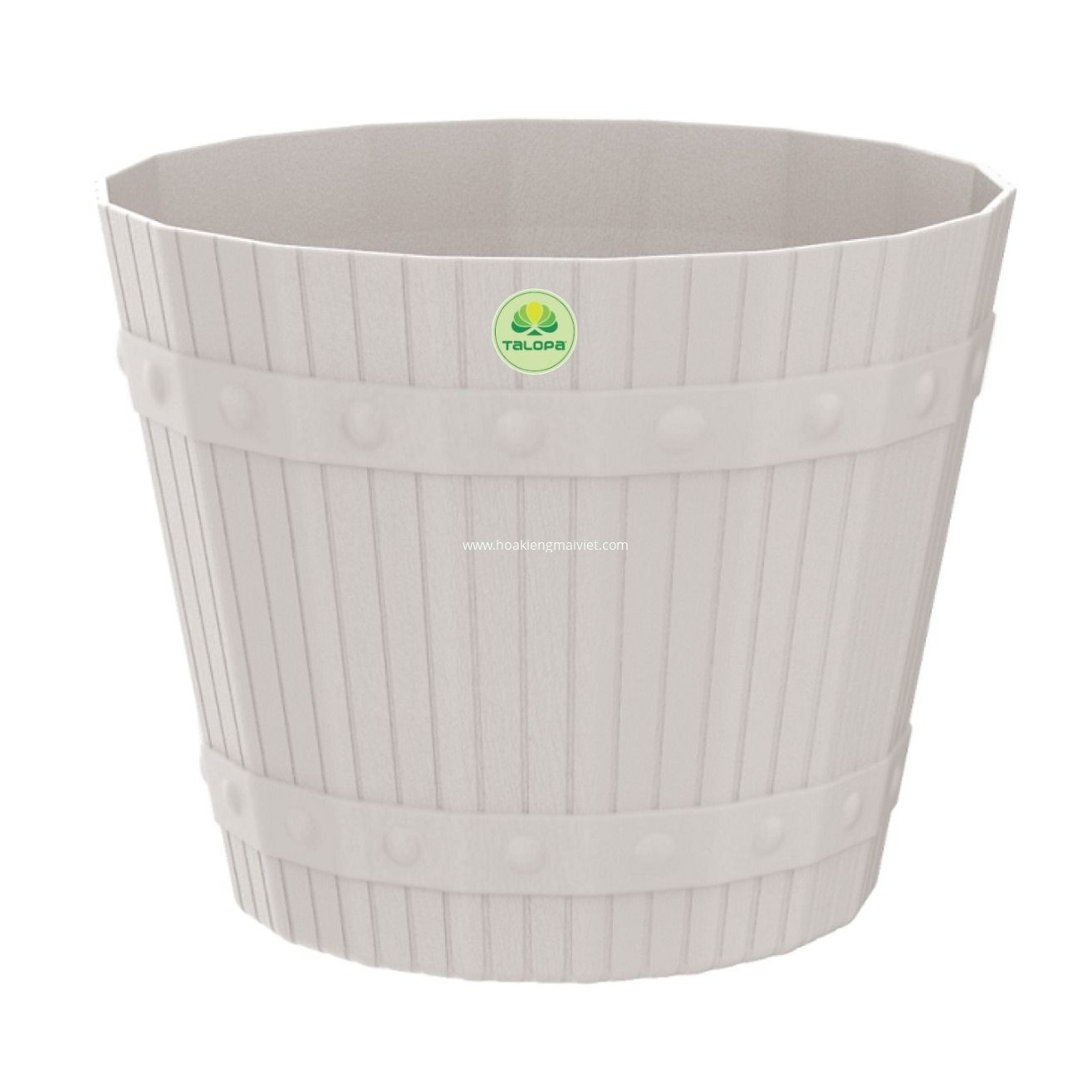 Chậu nhựa giả thùng gỗ dây đai (sản xuất bởi TaLoPa) có kích thước nhỏ, vừa, lớn; màu trắng, nâu, gỗ, cam. Thiết kế cổ điển, chất liệu nhựa PP bền nhẹ, thích hợp trang trí bàn làm việc, sân vườn, ban công.