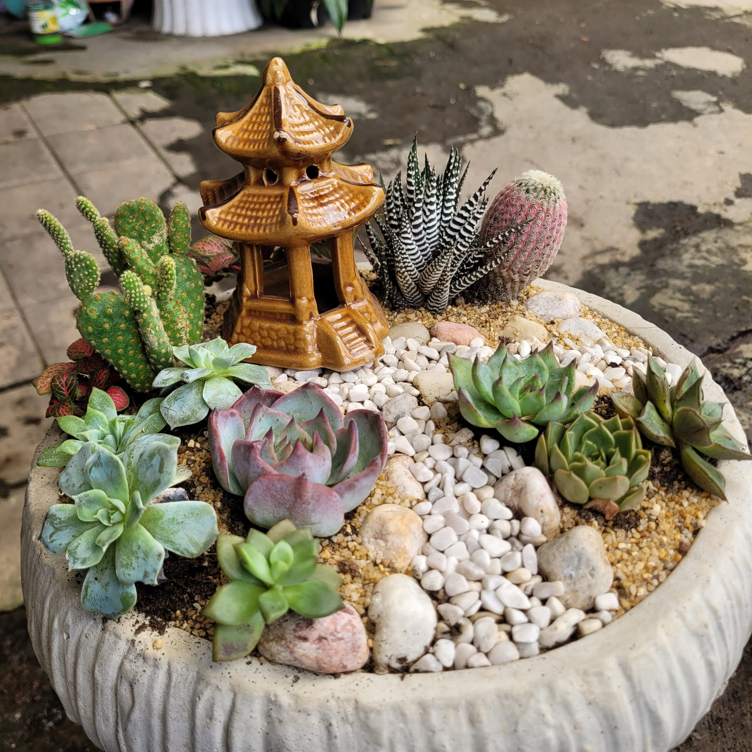 ✨ Vật phẩm trang trí như ngôi nhà nhỏ, tượng gốm, tháp mini… khiến tiểu cảnh trở nên có hồn, như một câu chuyện đang kể